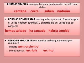 PDF CONJUGACIÓN DE VERBOS - Elbibliote.com Se denominan verbos irregulares aquellos en que, al ser conjugados, se operan modificaciones sea en la raíz, sea en alguna de las terminaciones que correspondería aplicar en base al modo y tiempo; sea en ambas. Sin embargo, existen casos en que alguna forma conjugada de determinados verbos recibe un cambio; pero no por